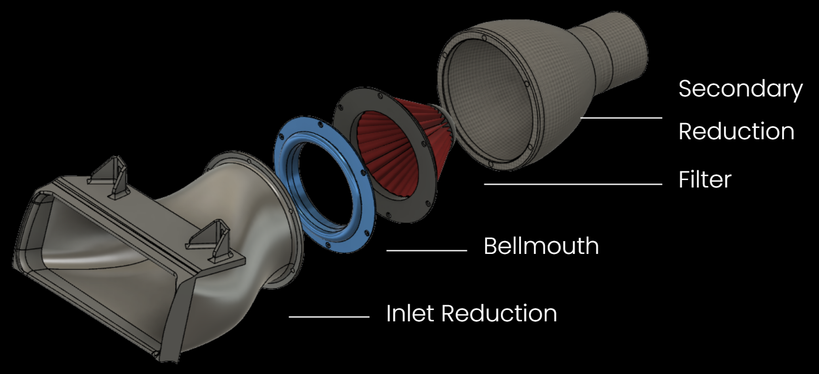 Pre-manifold intake system for a BMW E36 endurance racecar designed to increase airflow velocity and improve engine performance.