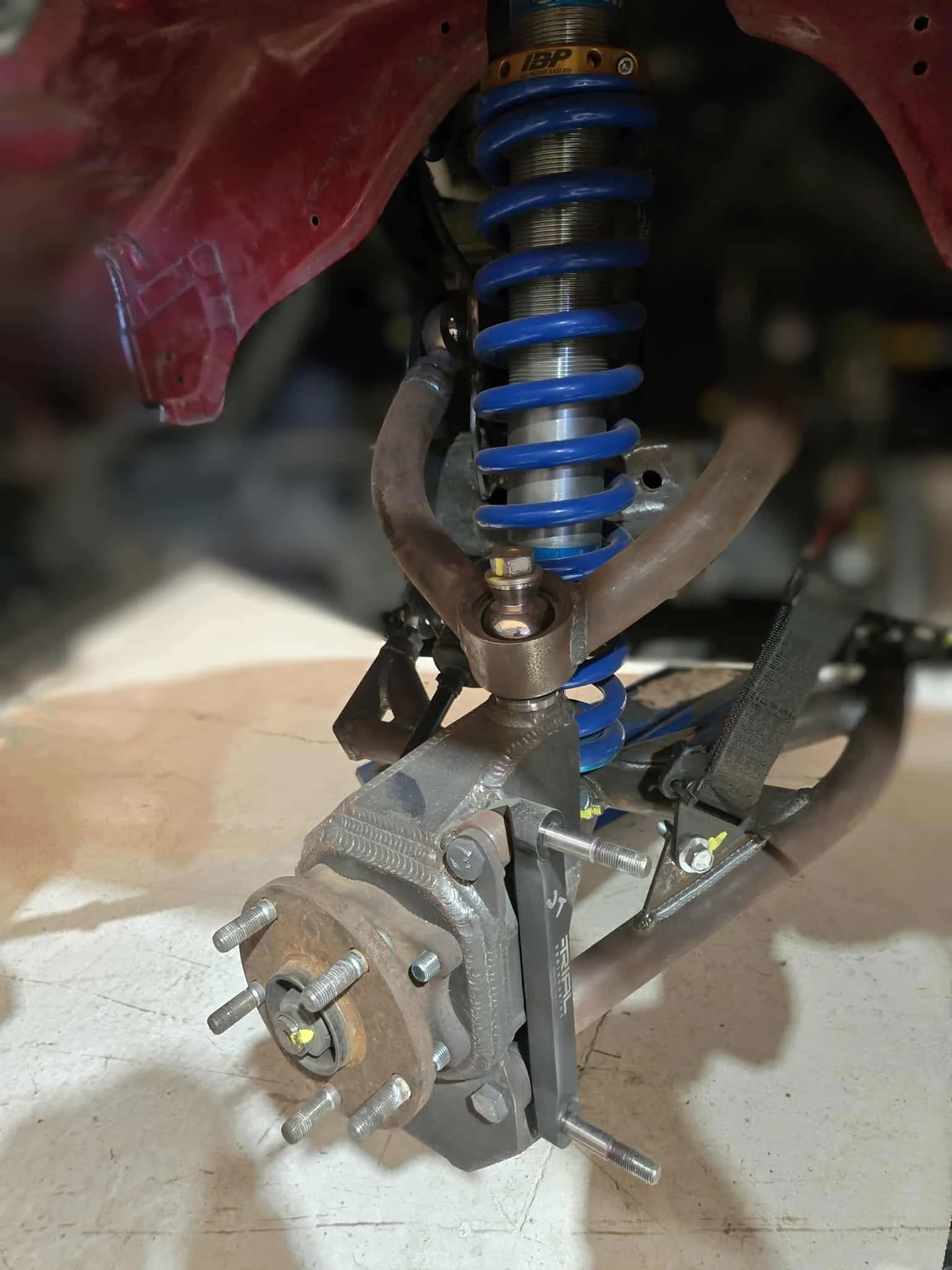 Custom front suspension system for a rally-prepped 2006 Chevy Colorado, including uprights and aftermarket brake integration.